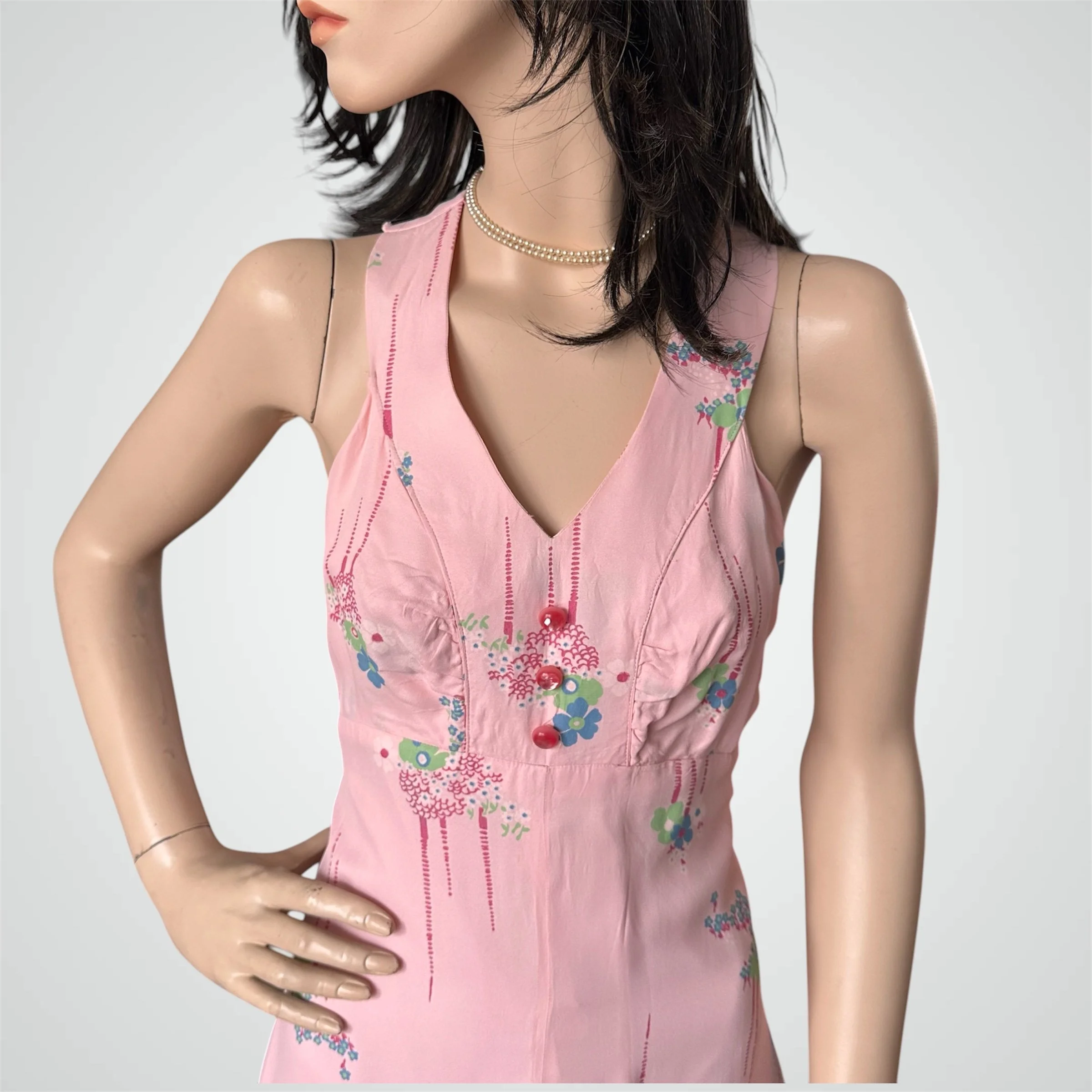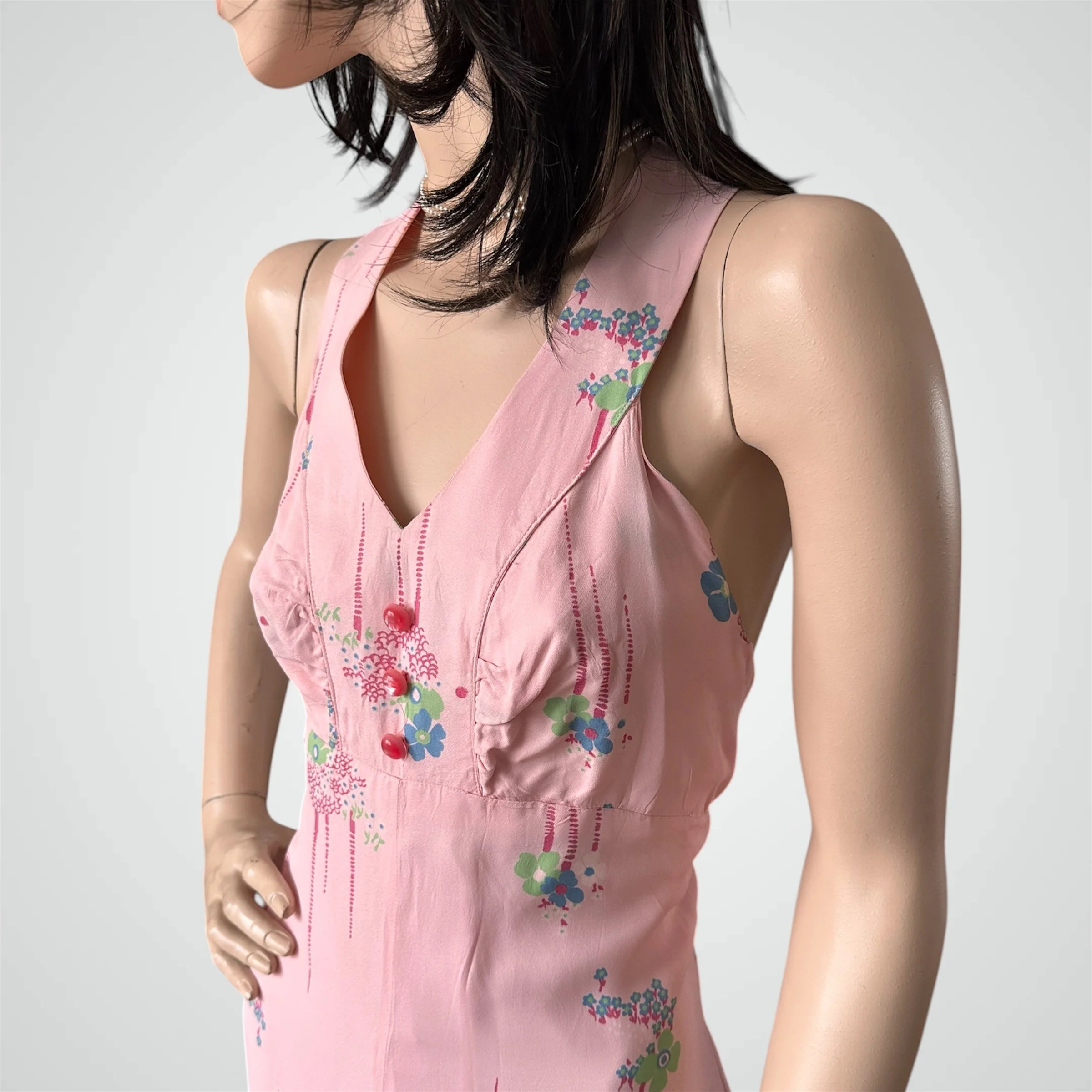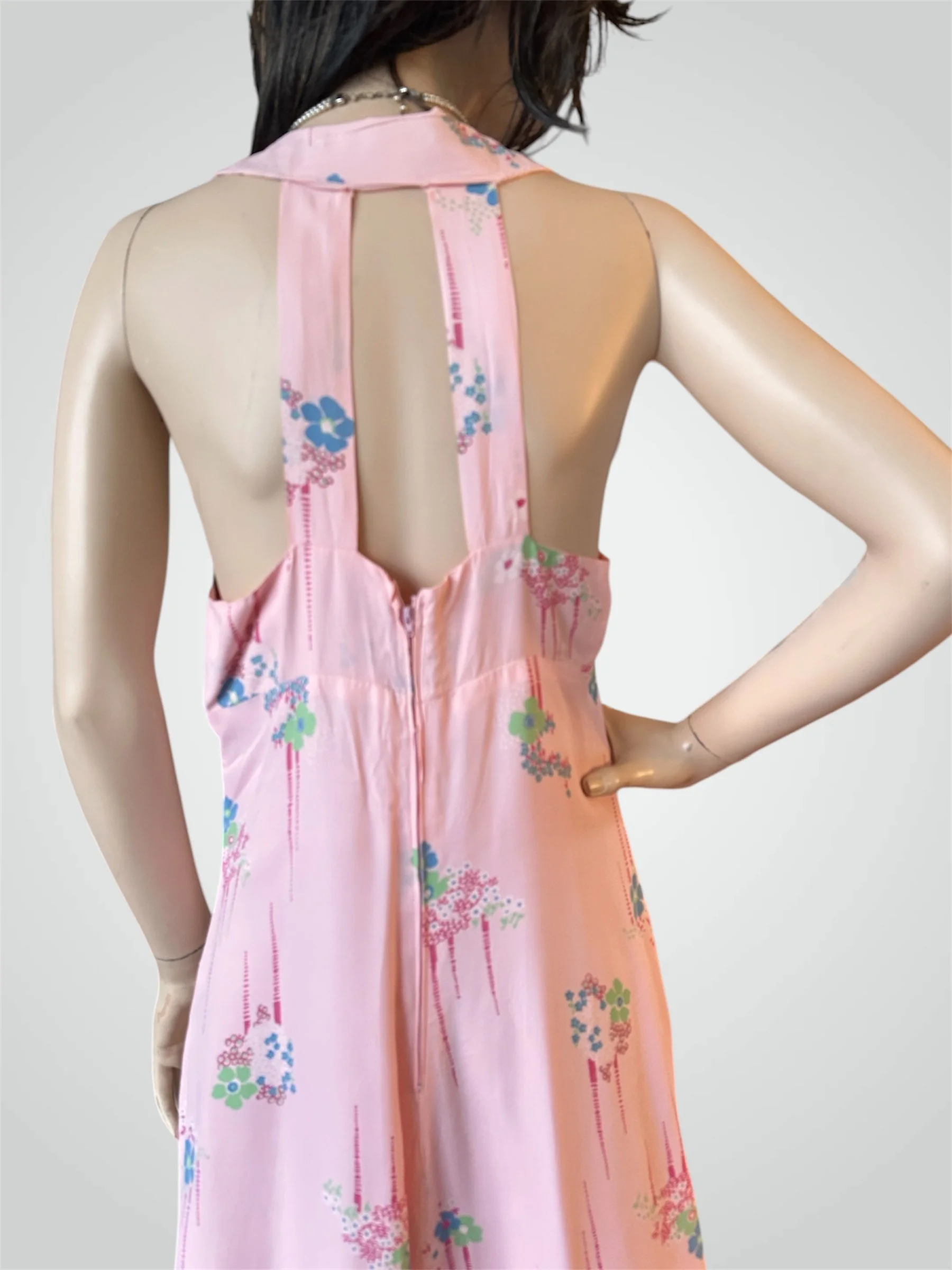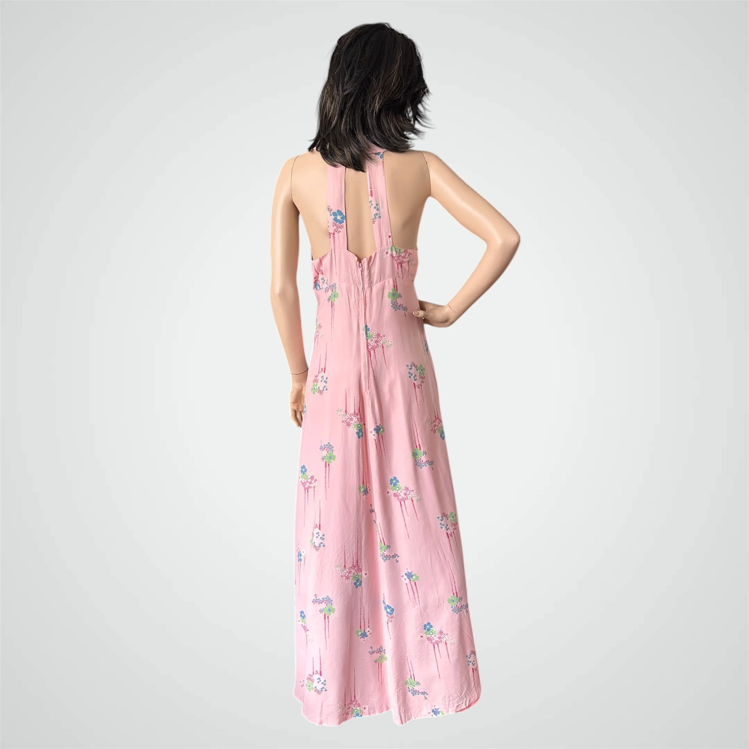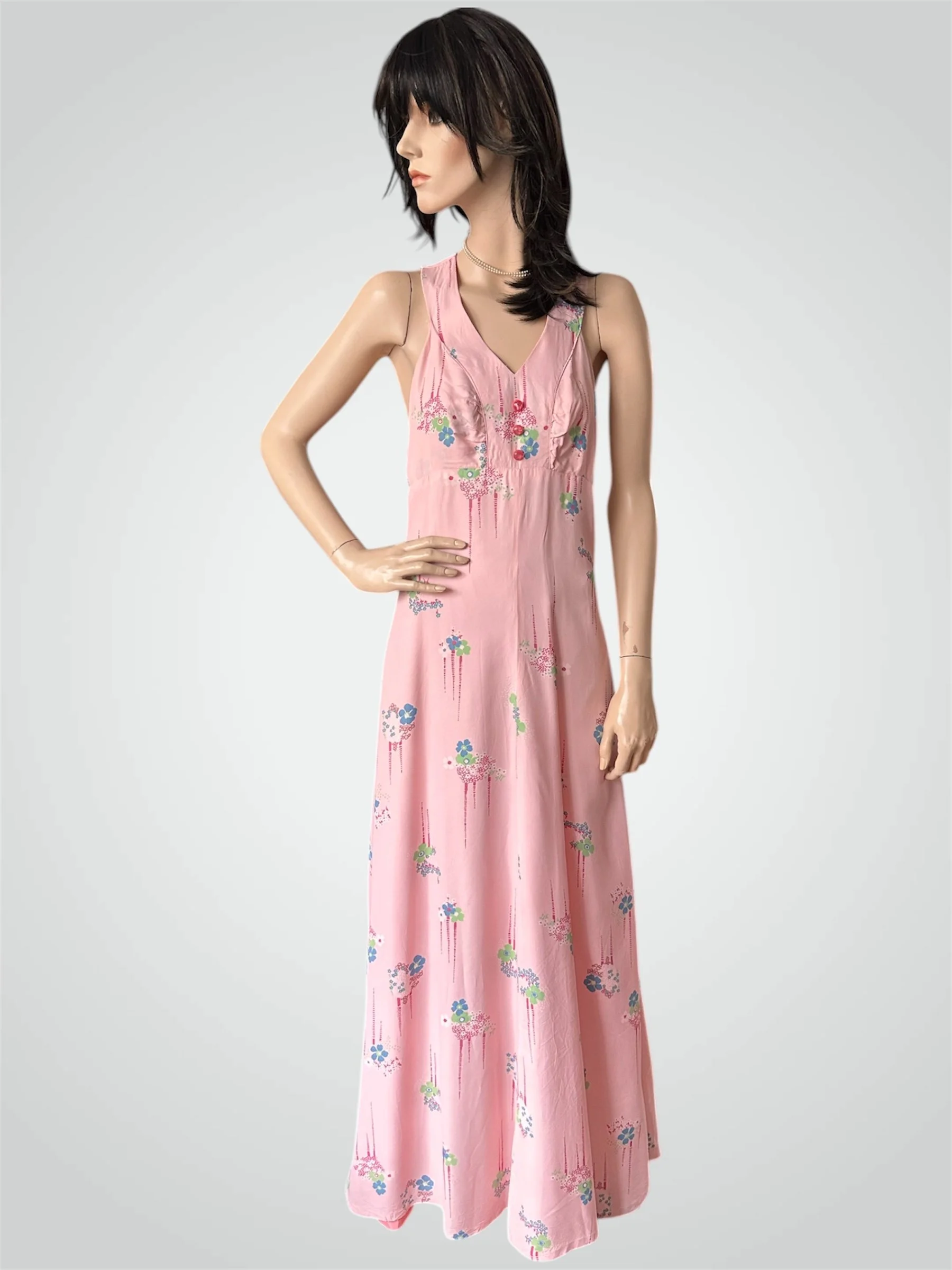 Vintage c. 1960s does 1930s sleeveless floral maxi dress with double strap open back. The dress is handmade from a stunning medium weight rayon (likely from the 1930s), in light pink with blue and green flower print. It has an empire waist and 3 pink moonglow buttons at the front. It is fully lined with zipper closure at the back. Would fit modern size XSmall to Small and someone tall - please see measurements below.