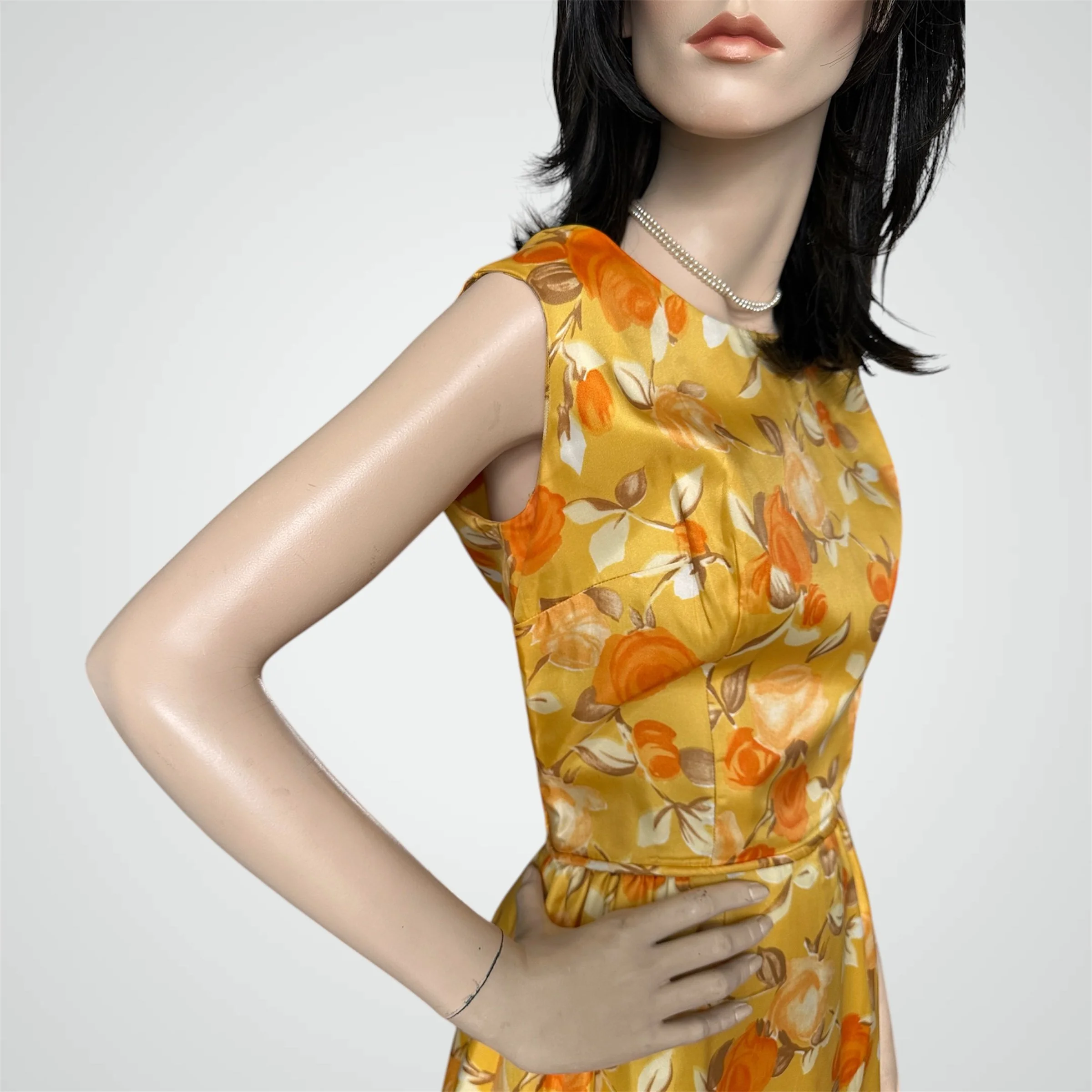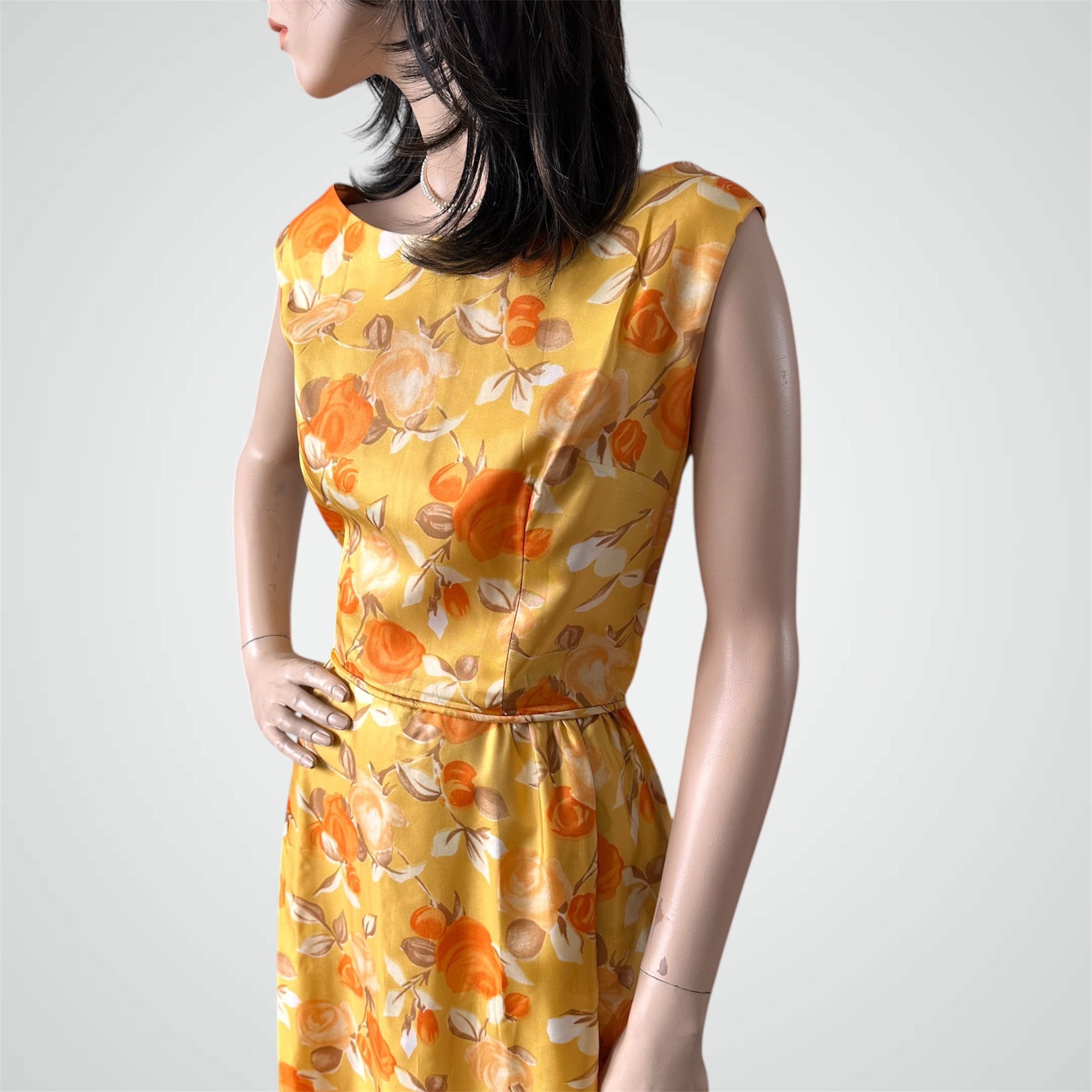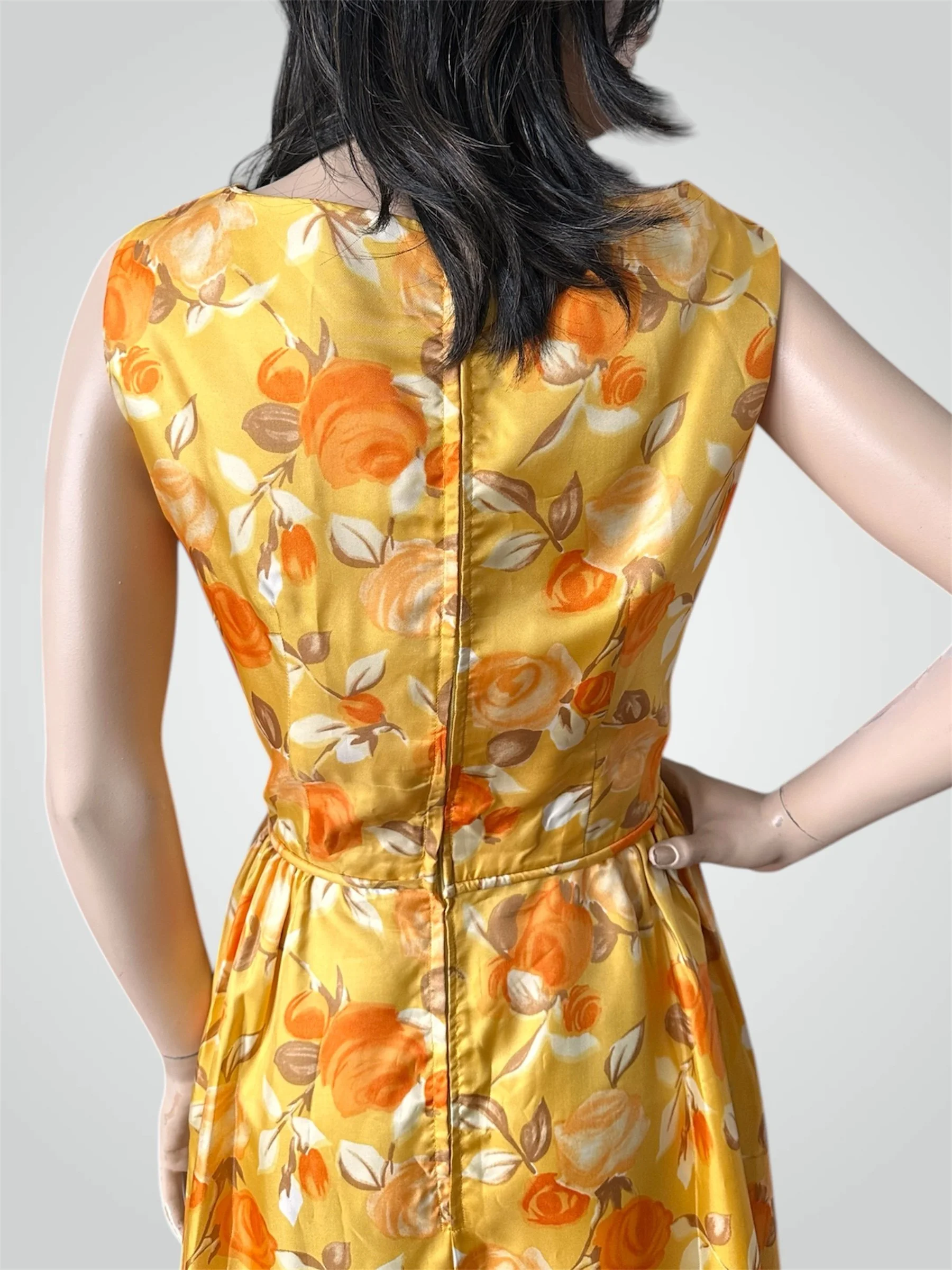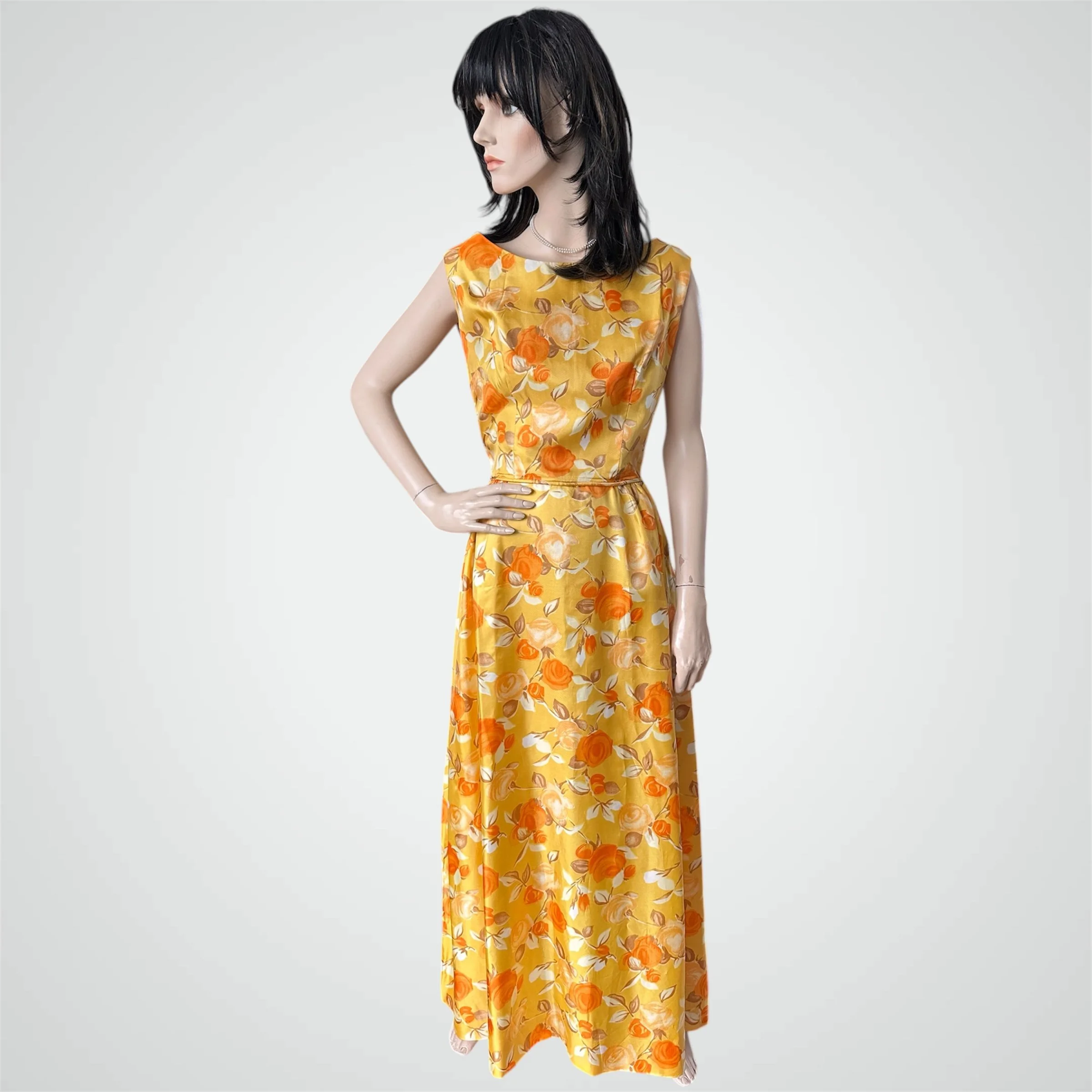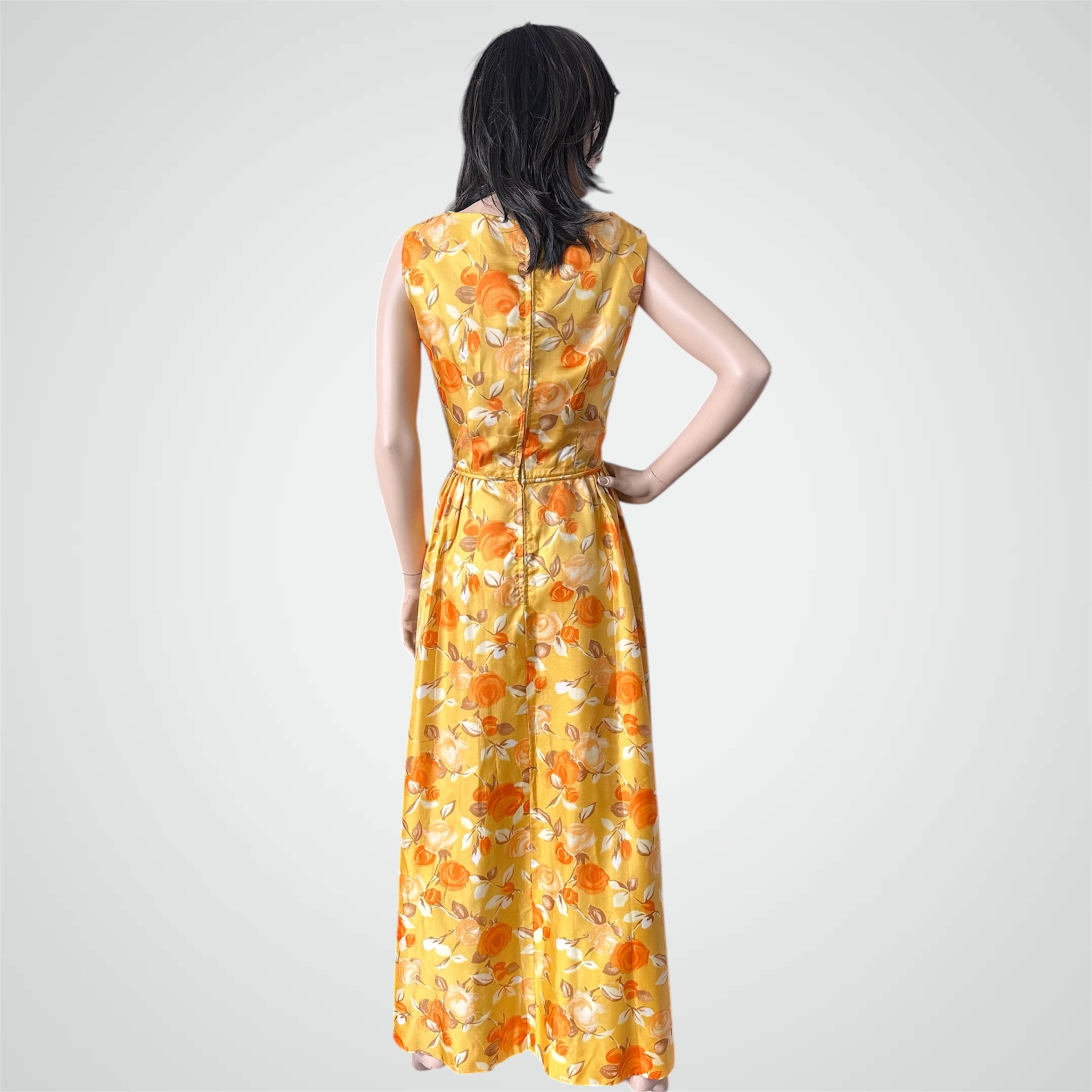 Vintage c. 1960s yellow with orange and white floral print sleeveless maxi dress. The fabric is a very high quality satiny feeling polyester. It is fully lined with zipper closure at the back. Would fit modern size Small and someone tall - please see measurements below.