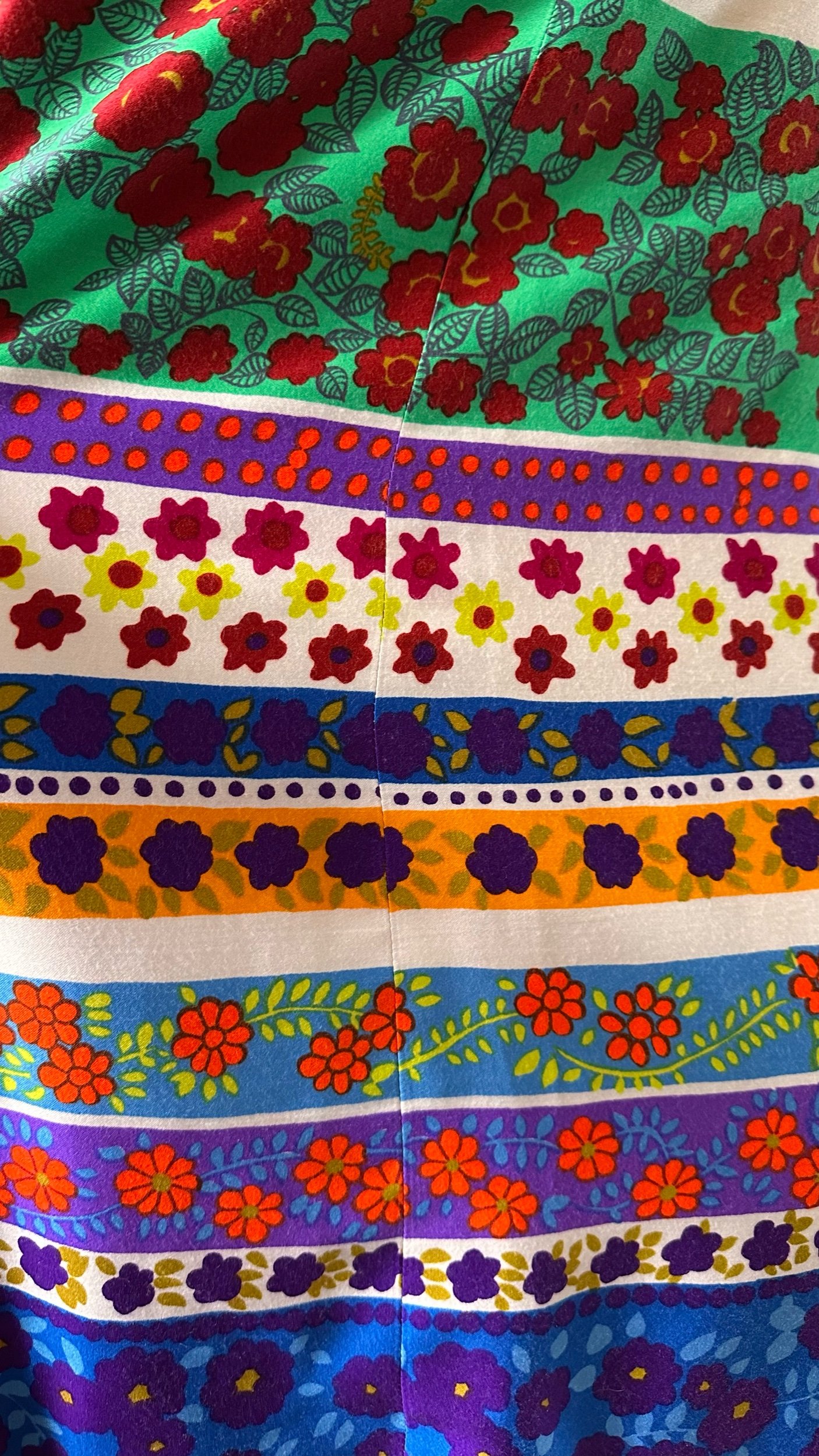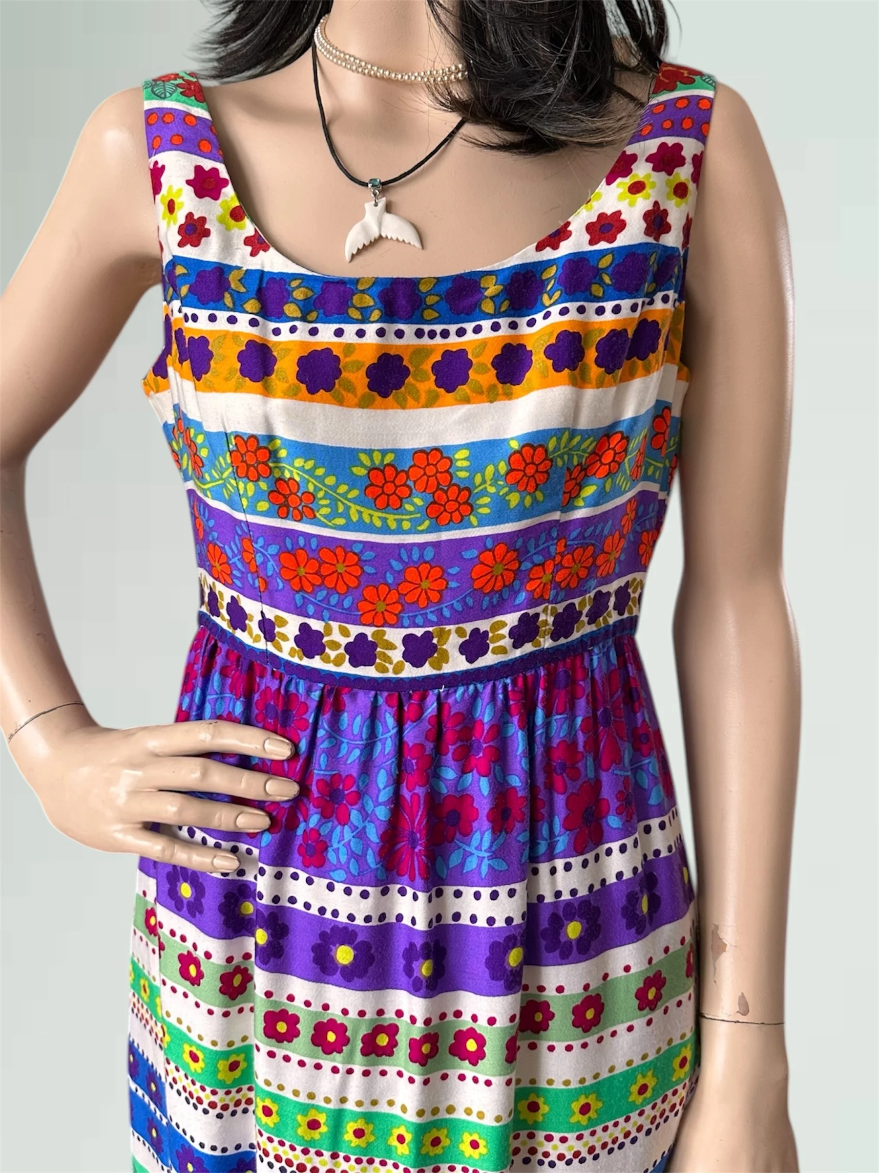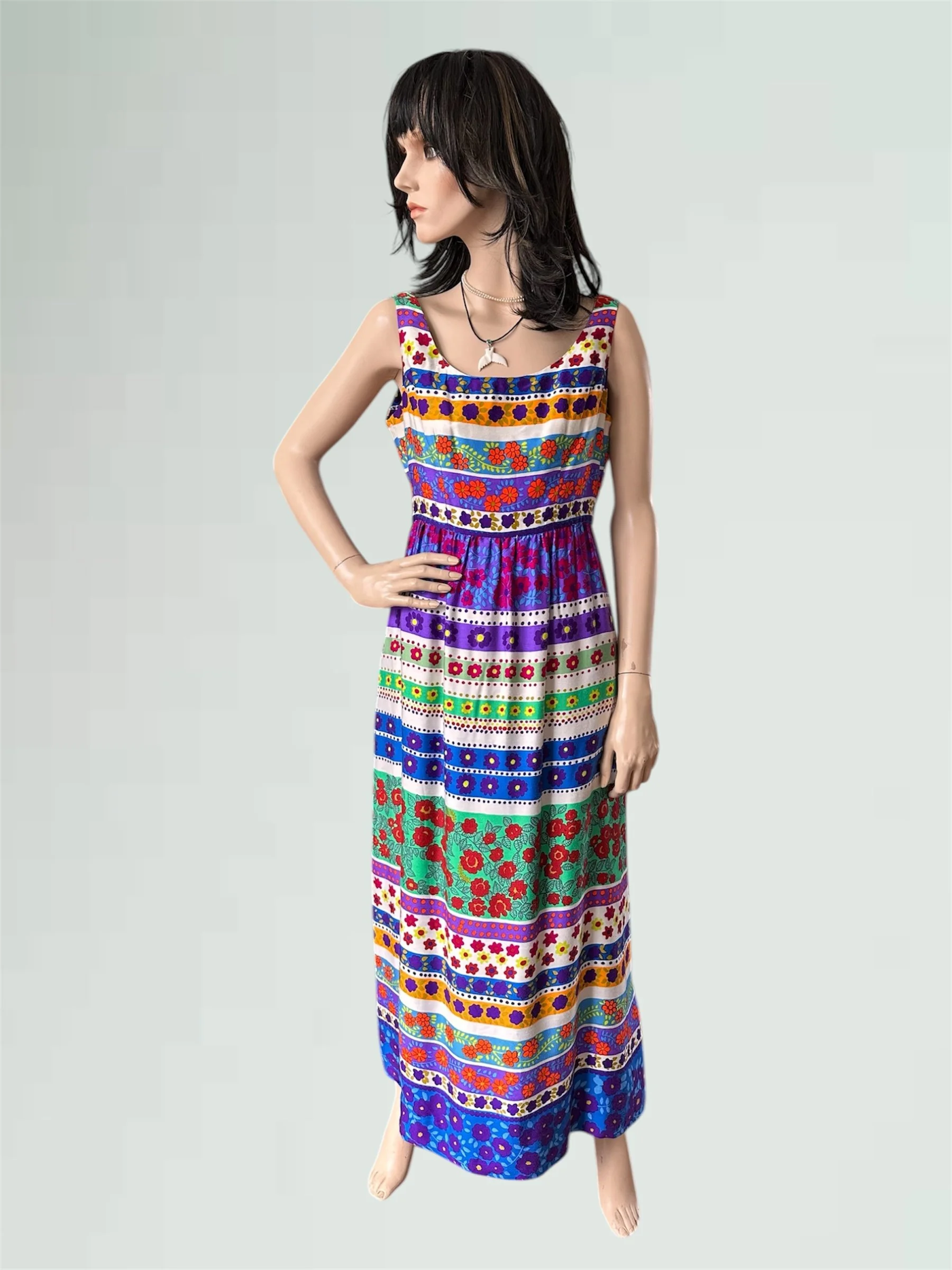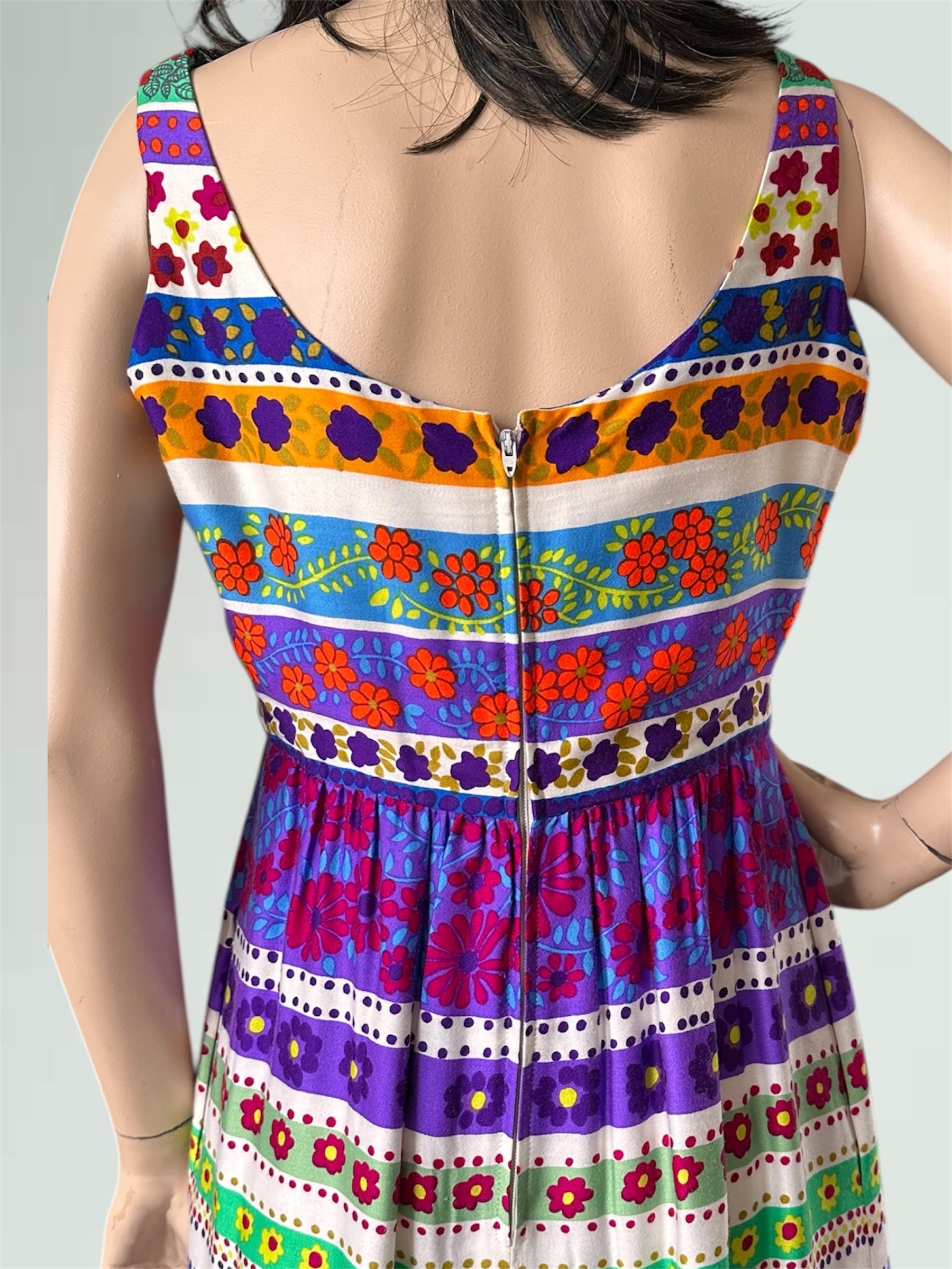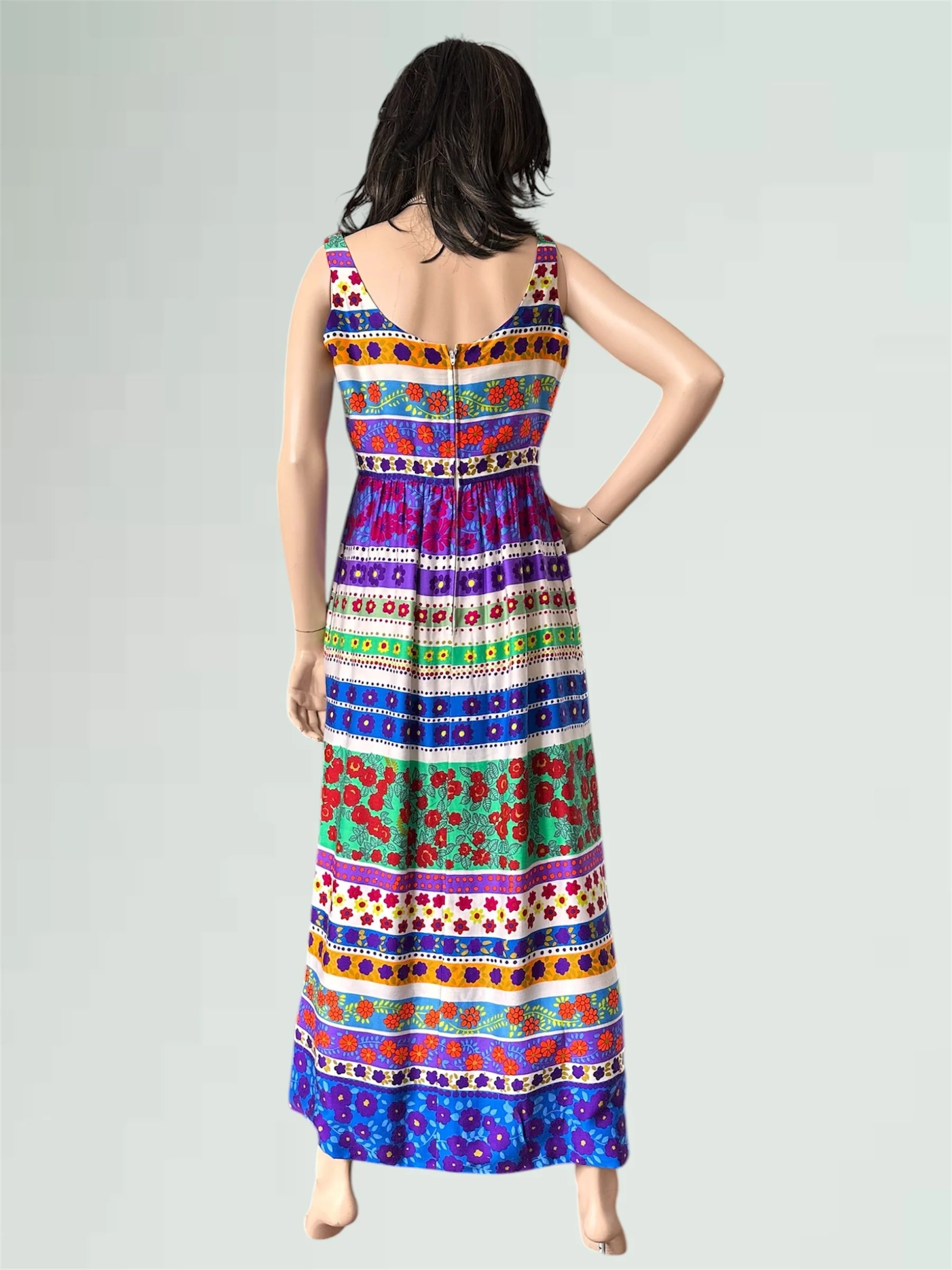 Vintage c. 1970s sleeveless maxi dress with scoop neckline at front and back. The dress has the most amazing and vibrant floral print with different rows of flowers, dots and vines. It has a fitted bodice and empire waist and ankle length peasant style skirt that is lined with soft light cotton. It even has pockets and snaps built in at the shoulders to hold a bra strap! Zipper closure at the back. Would fit modern size XS (2-4).
