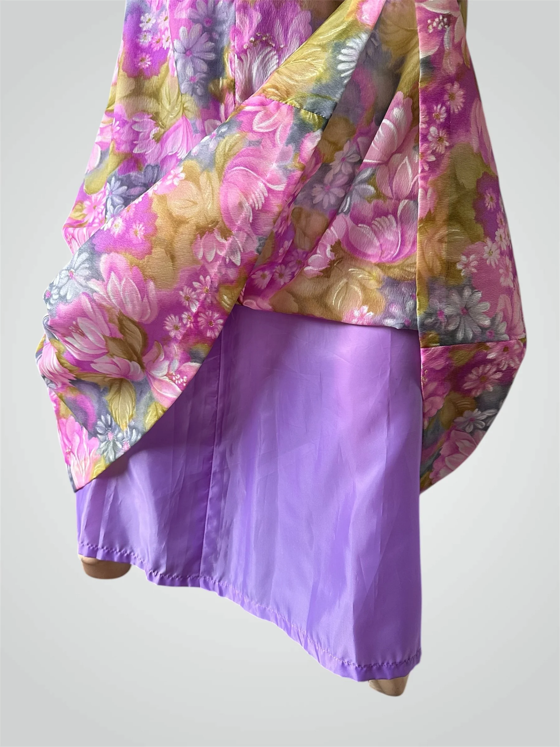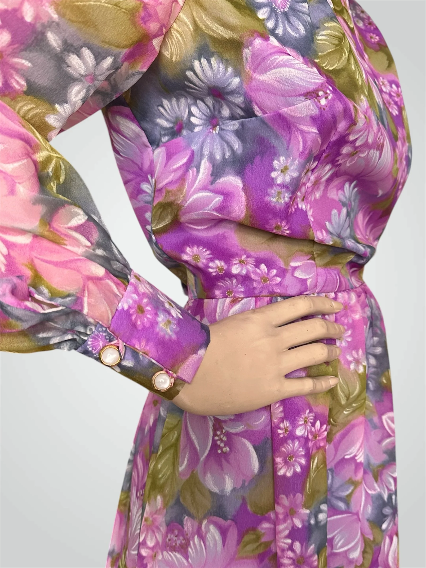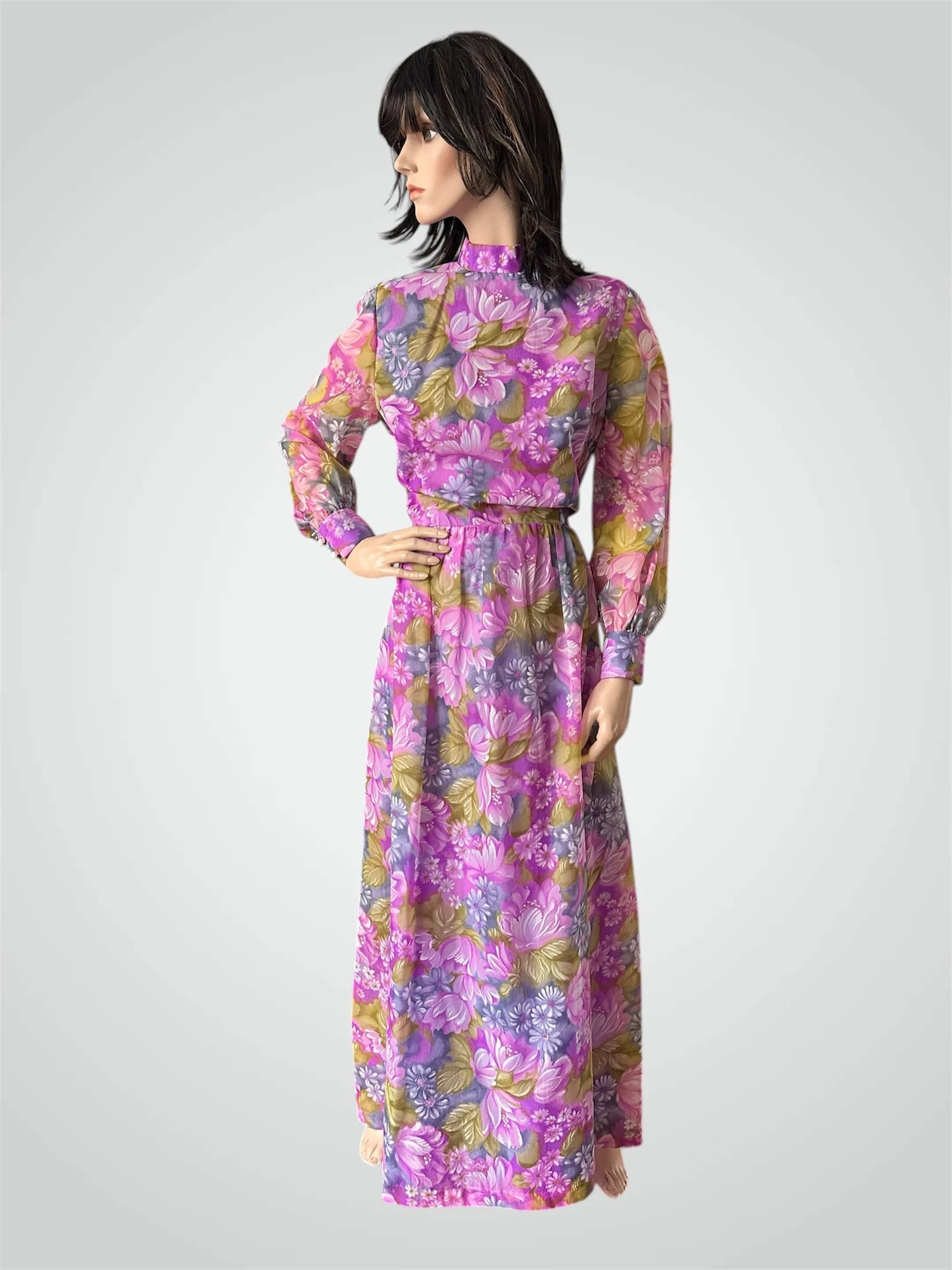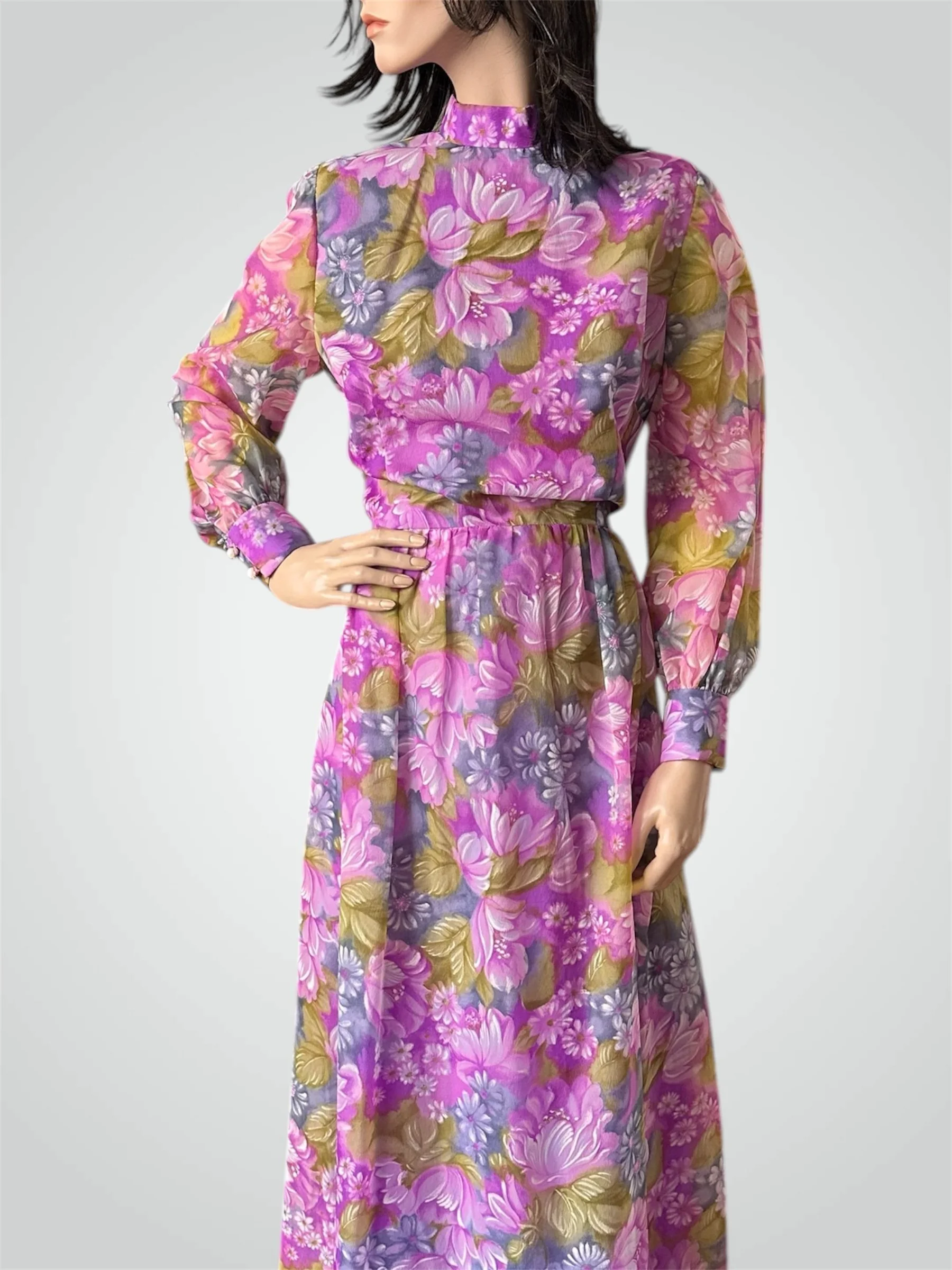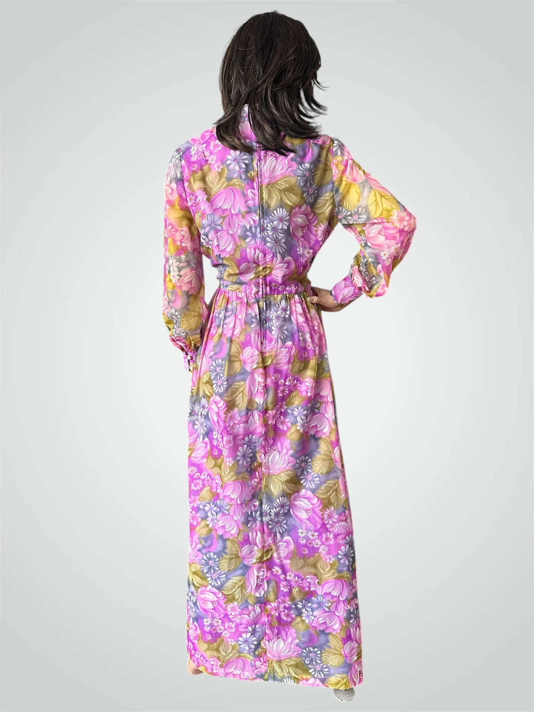 Vintage c. 1970s long sleeved floral maxi dress, size Large. The dress is made with a semi-sheer gauzy polyester in the most beautiful floral print - looks like a painting! It is fully lined except for the sleeves, which have two buttons for closure. Zipper closure at the back. Would fit modern size Medium to Large - please see measurements below.
