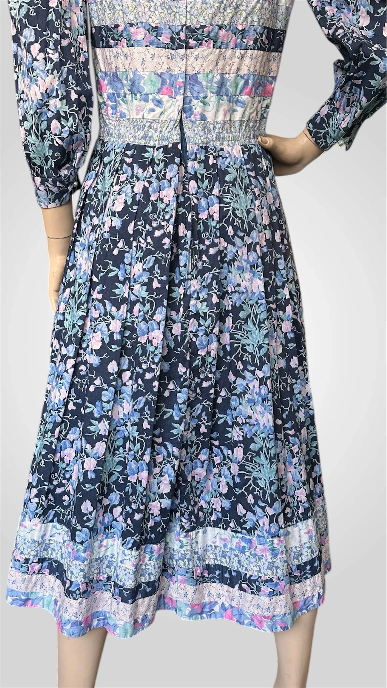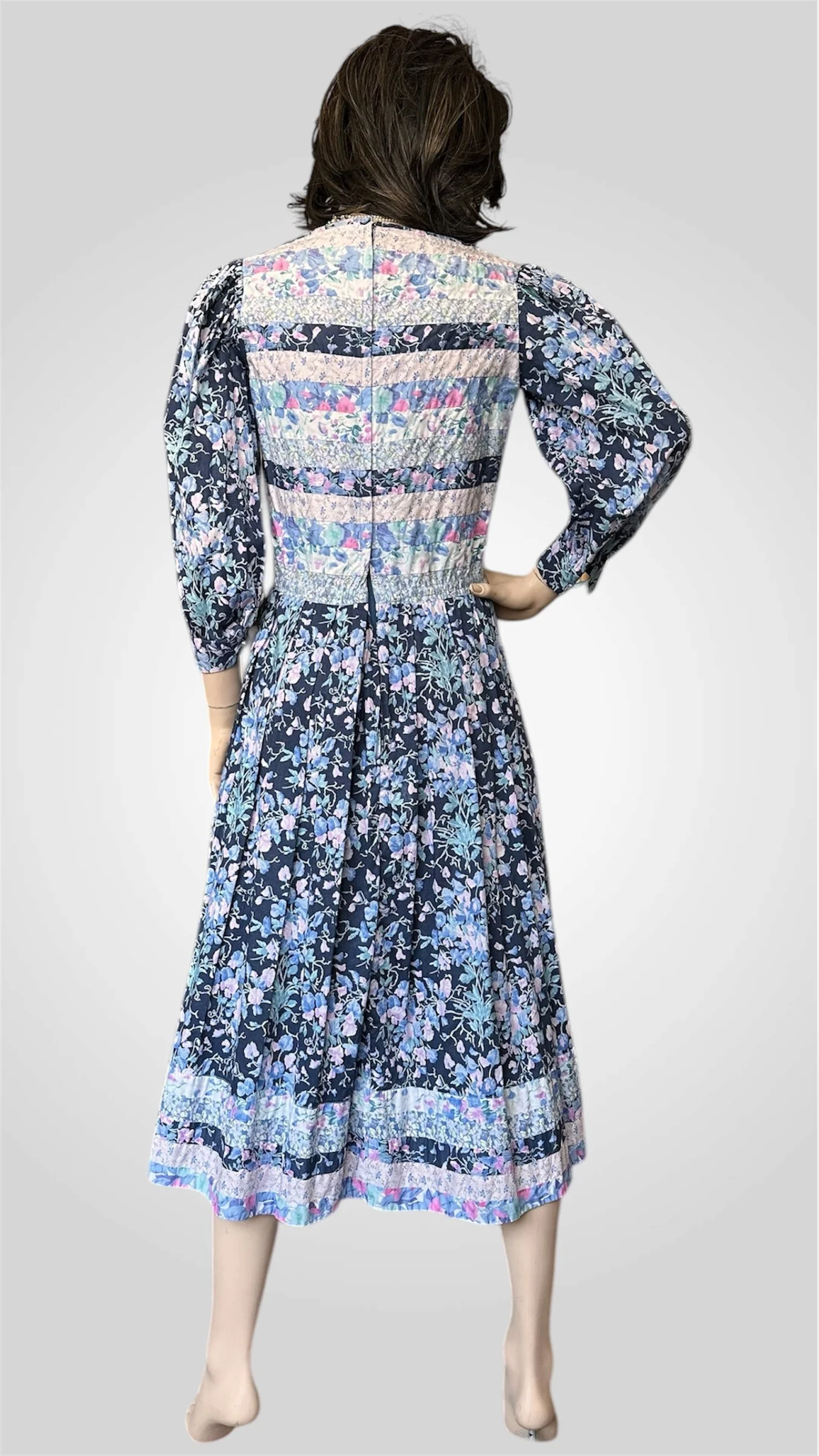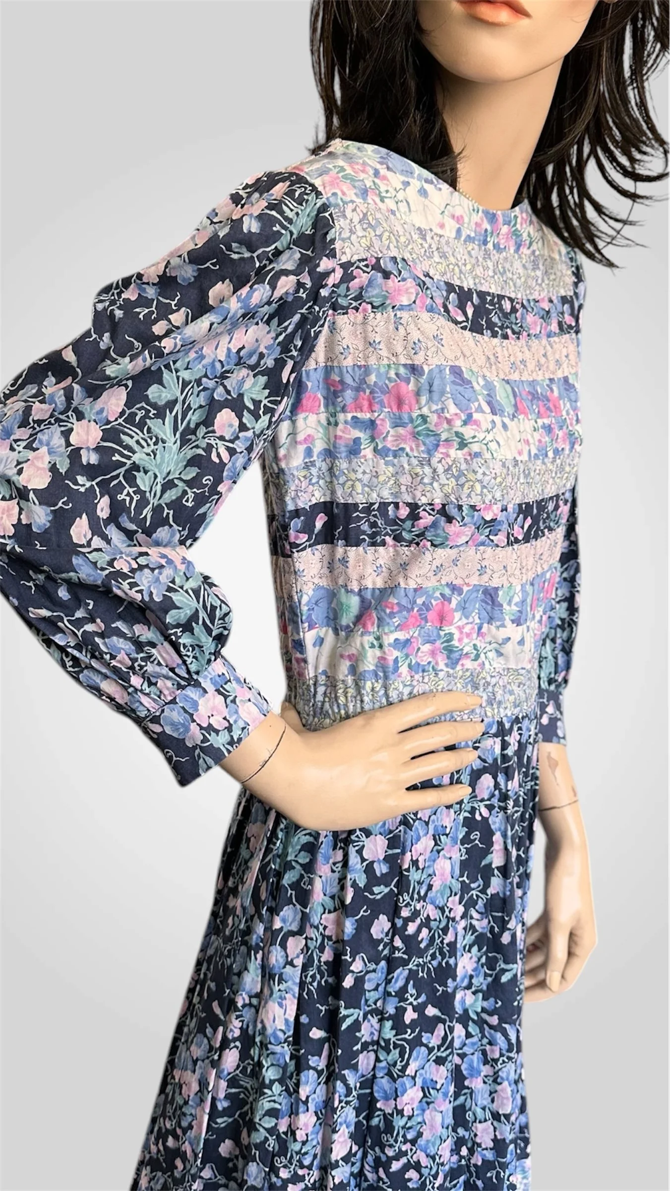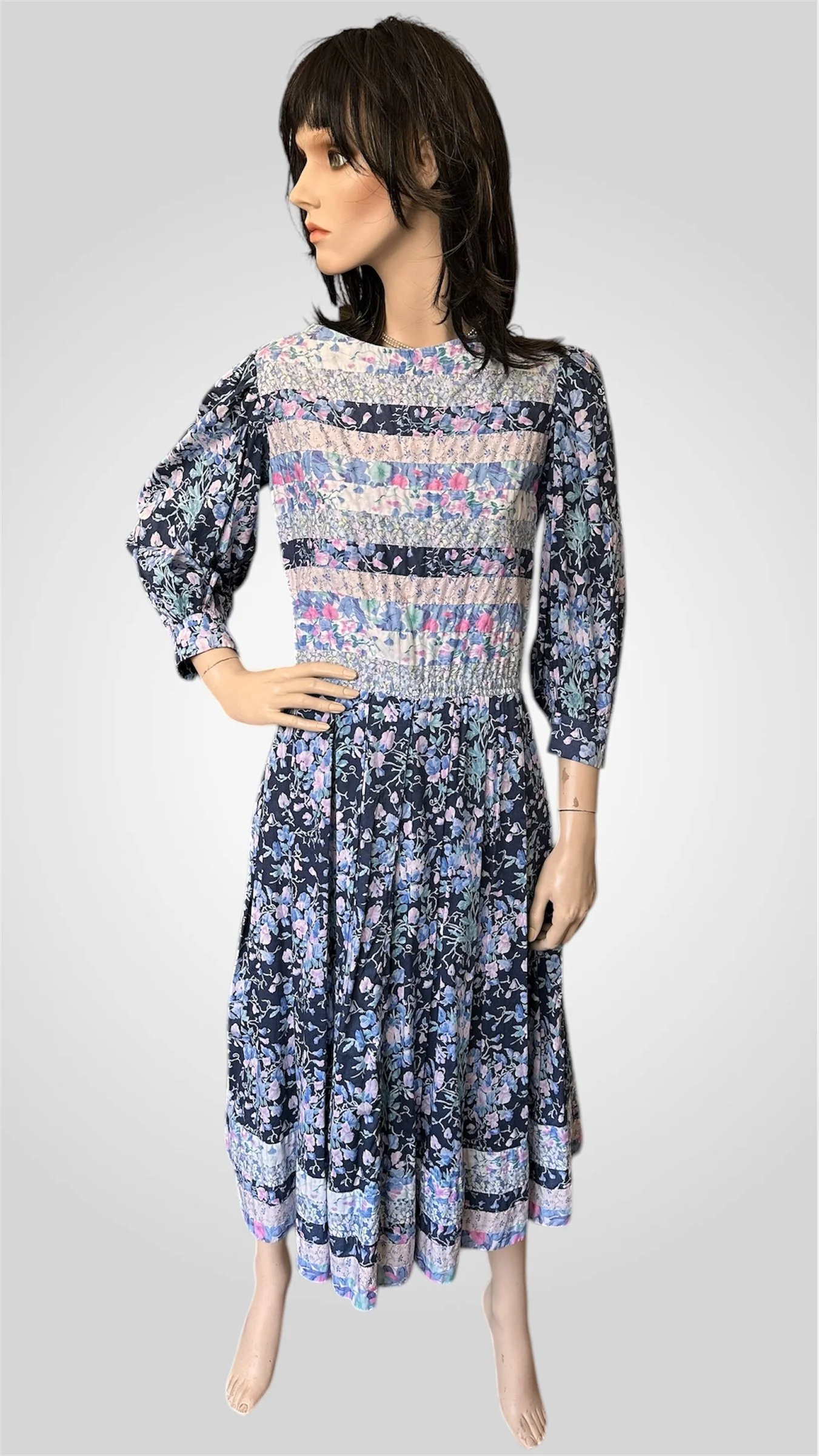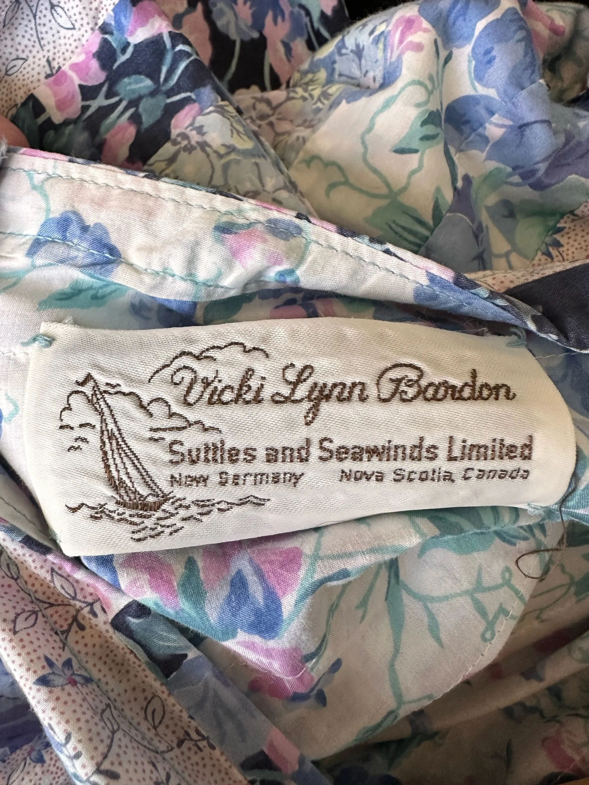 Gorgeous vintage c. 1980s 100% cotton dress by Canadian designer Victoria Lynn-Bardon (Suttles & Seawinds). The floral dress has a wide almost boat-style neckline, a patchwork bodice and hemline, 3/4 length puff sleeves with buttoned cuffs, and a lovely peasant style skirt with pockets. It has a zipper closure up the back. Made in Nova Scotia, Canada. Would best fit a modern size small with bust up to 34".