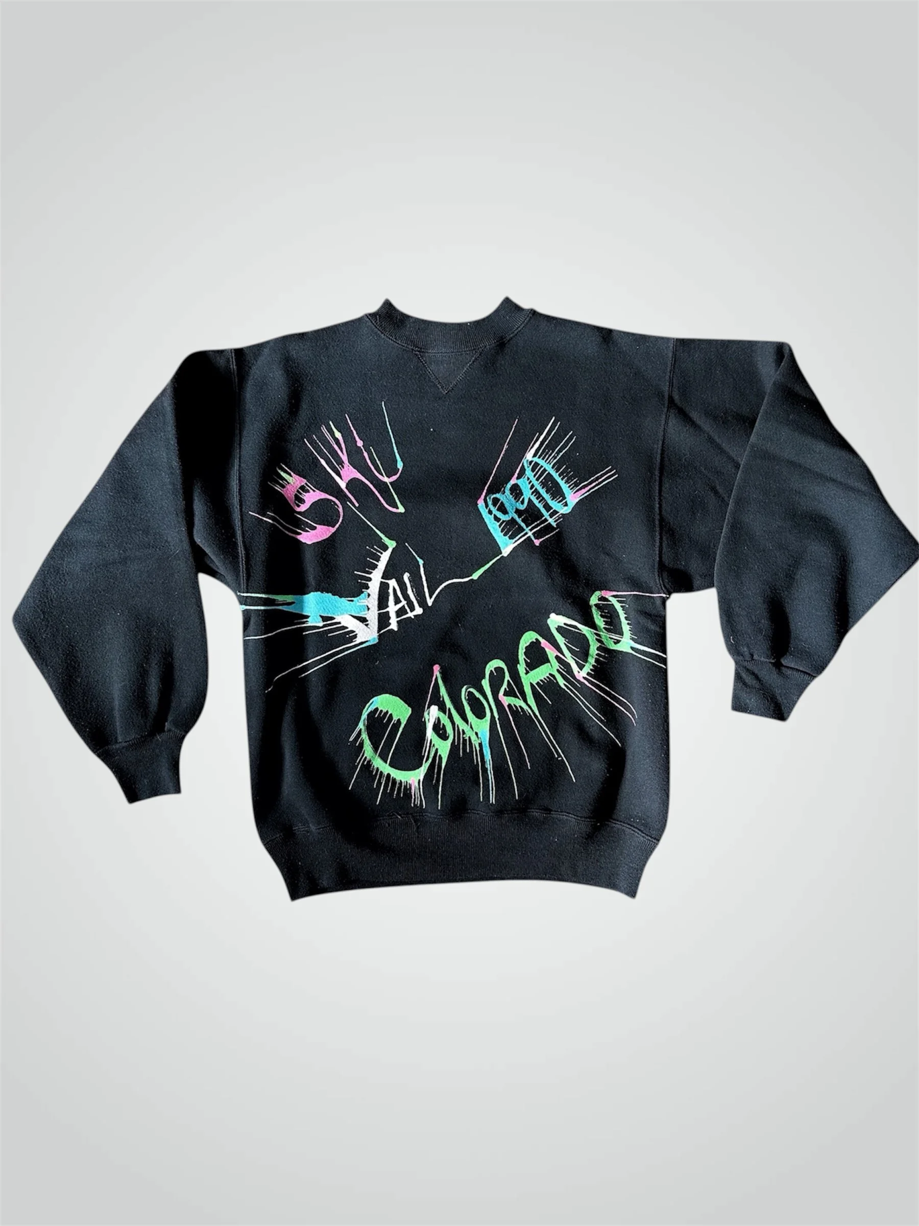 1990 Ski Vail Colorado 50% cotton crew neck sweatshirt in black with fluorescent lettering. Marked size Medium.