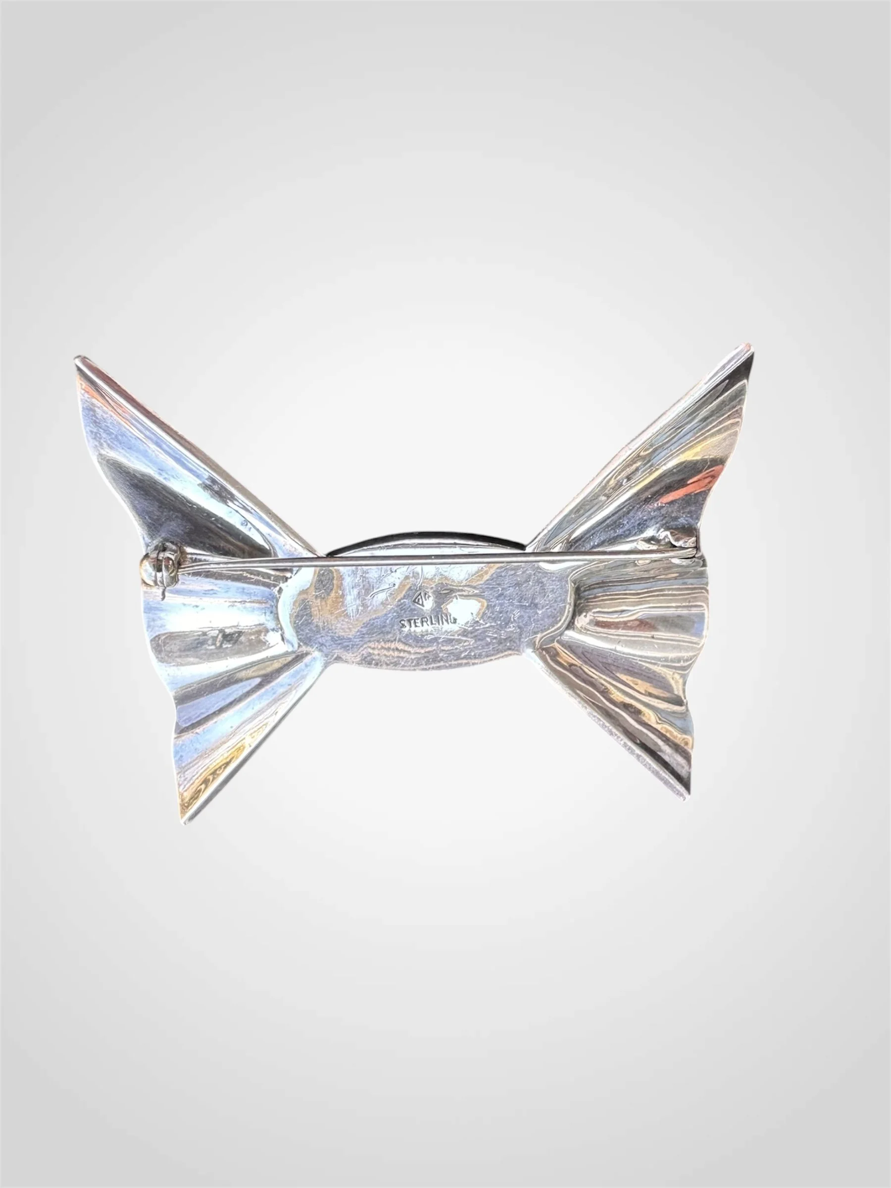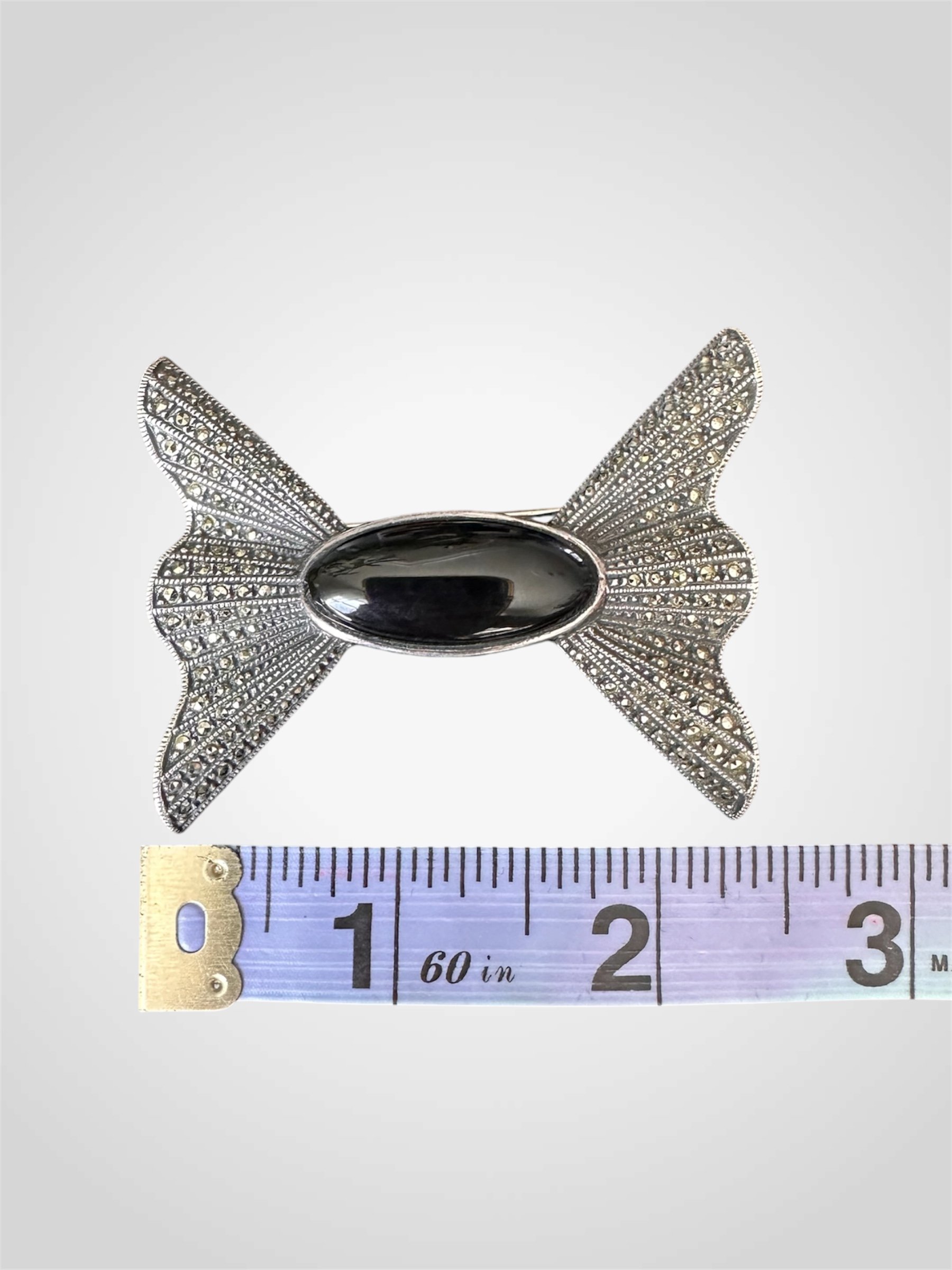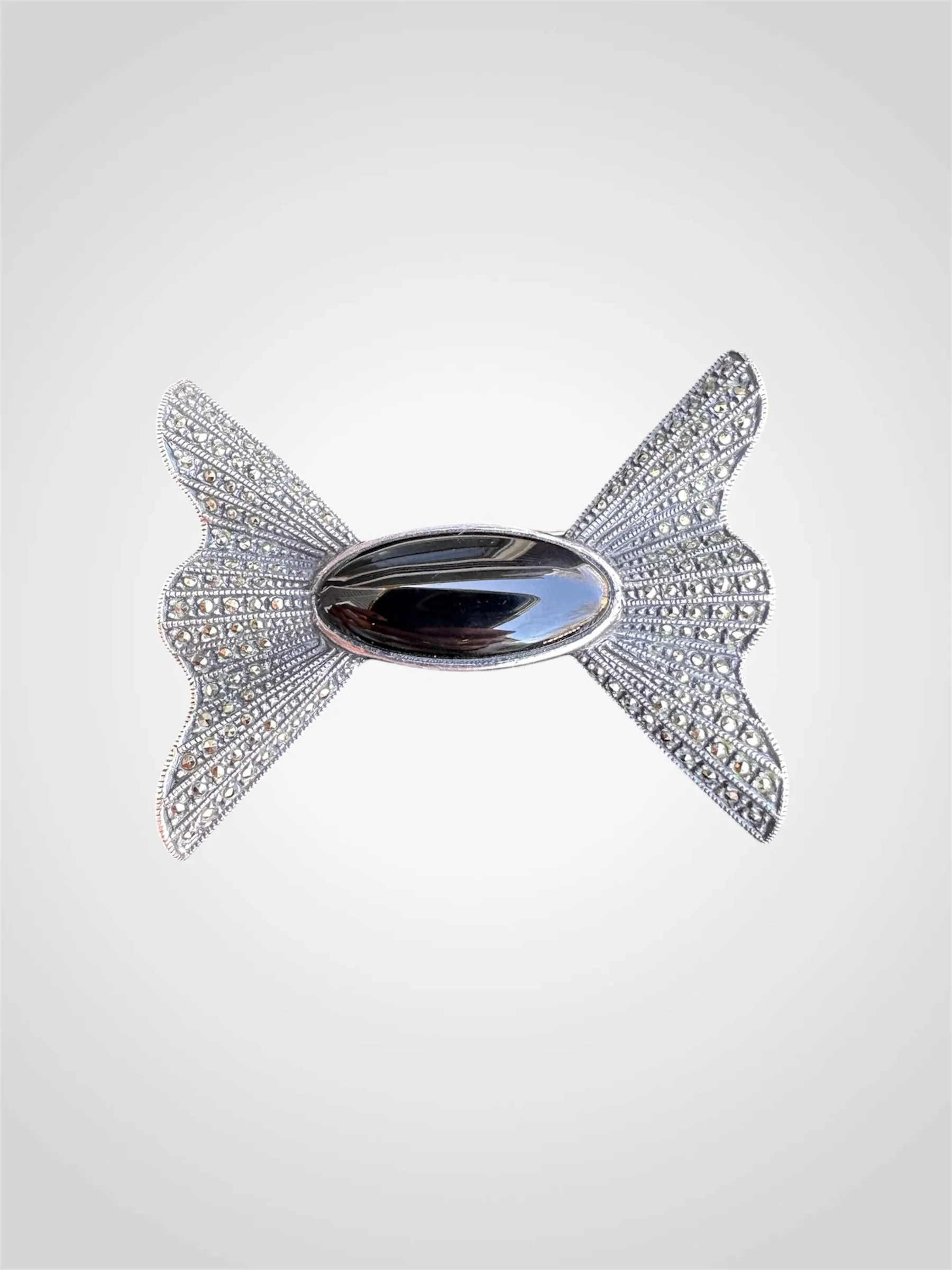 Lovely vintage c. 1950s sterling silver and marcasite bow brooch with black onyx cabochon centre. It is stamped with ‘sterling’ under the maker’s mark at the back. It has a straight pin with safety clasp for closure. In very good vintage condition - some scratches to the silver at the back and pin head is slightly curved but fits the clasp perfectly.