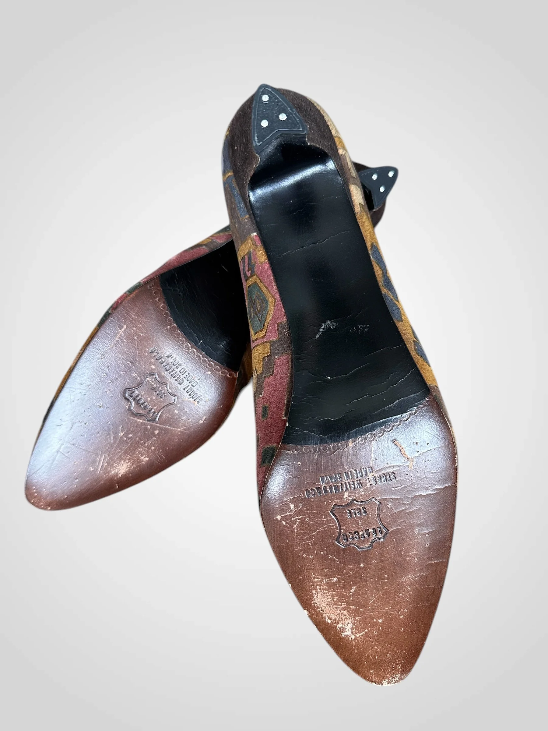Gorgeous vintage 1980s-1990s Stuart Weitzman for Mr. Seymour dyed & painted suede pumps. These super stylish and well made shoes have a leather insole and sole and suede heel and upper. They have an amazing geometric pattern in brown, mustard and mauve with gold detailing. They are marked size 10 but they fit like a size 9. Please see measurements below.